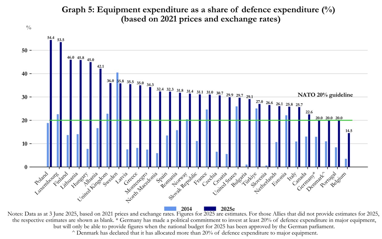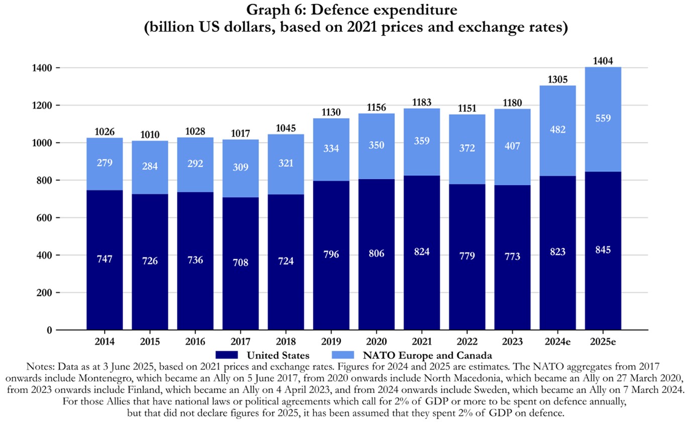 This numbers imbalance remained despite an increase in defense expenditure by NATO Europe and Canada of 100.4 % between 2014 and 2025. Meanwhile, the US increased its defense spending by approximately +13% during the same period.