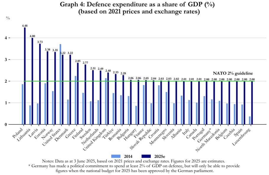 [28] Andrew Gray et al., NATO Agrees to Higher Defence Spending Goal, Spain Says It Is Opting Out, June 23, 2025, https://www.reuters.com/world/europe/nato-countries-approve-hague-summit-statement-with-5-defence-spending-goal-2025-06-22/.