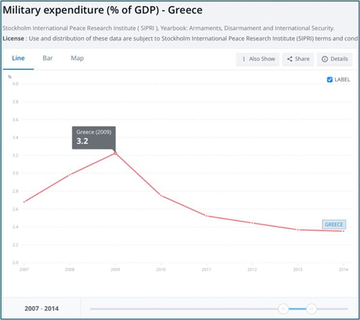 First, although widely mobilized, the GDP-based metric for defense spending does not account for the economic variations across countries, rendering the defense budget vulnerable to national economic fluctuations rather than indicative of deliberate strategic defense planning or capabilities.[23] This phenomenon has been seen during the Eurozone crisis, for instance, when Greece’s defense budget escalated from 2.7% of GDP in 2007 to 3.2% in 2009 before decreasing to 2.4% in 2014.