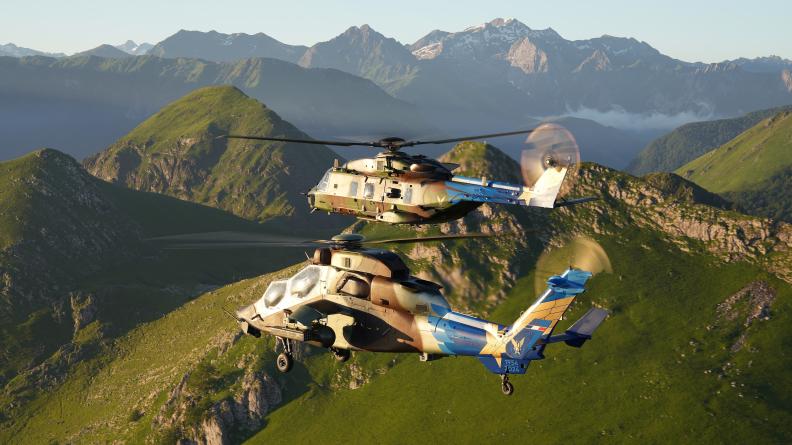 Photo : un Caïman en vol avec un Tigre lors de la célébration des 70 ans de l’aviation légère de l’armée de Terre française © armée de Terre, https://www.defense.gouv.fr/terre/actualites/alat-70-ans-maitrise-airs-dinnovation-tactique